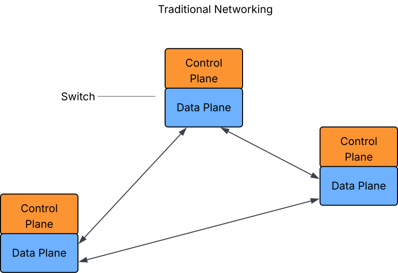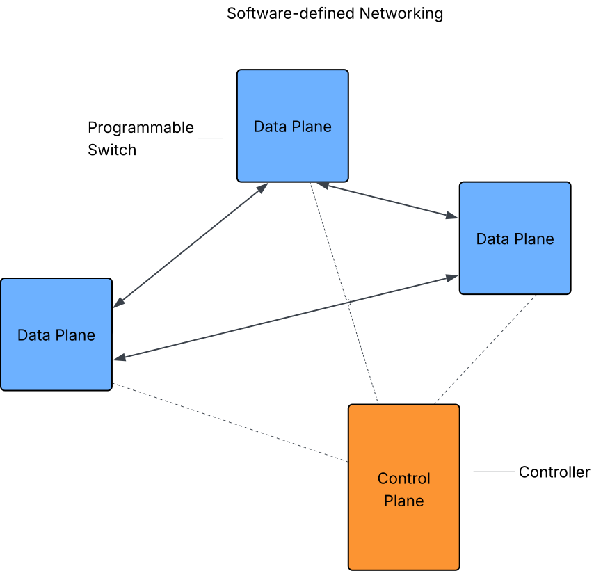 In computer networks, data is transmitted as packets across optimally-determined paths. Traditional networks manage both packet forwarding and path determination within the same hardware device, such as routers and switches, relying on various independent protocols (ARP, STP, OSPF, EIGRP, BGP, etc.) to achieve different functions. This tight coupling hinders scalability and flexibility. Software-defined Networks (SDNs) address these limitations by decoupling the data plane (packet forwarding) from the control plane (path decision-making).