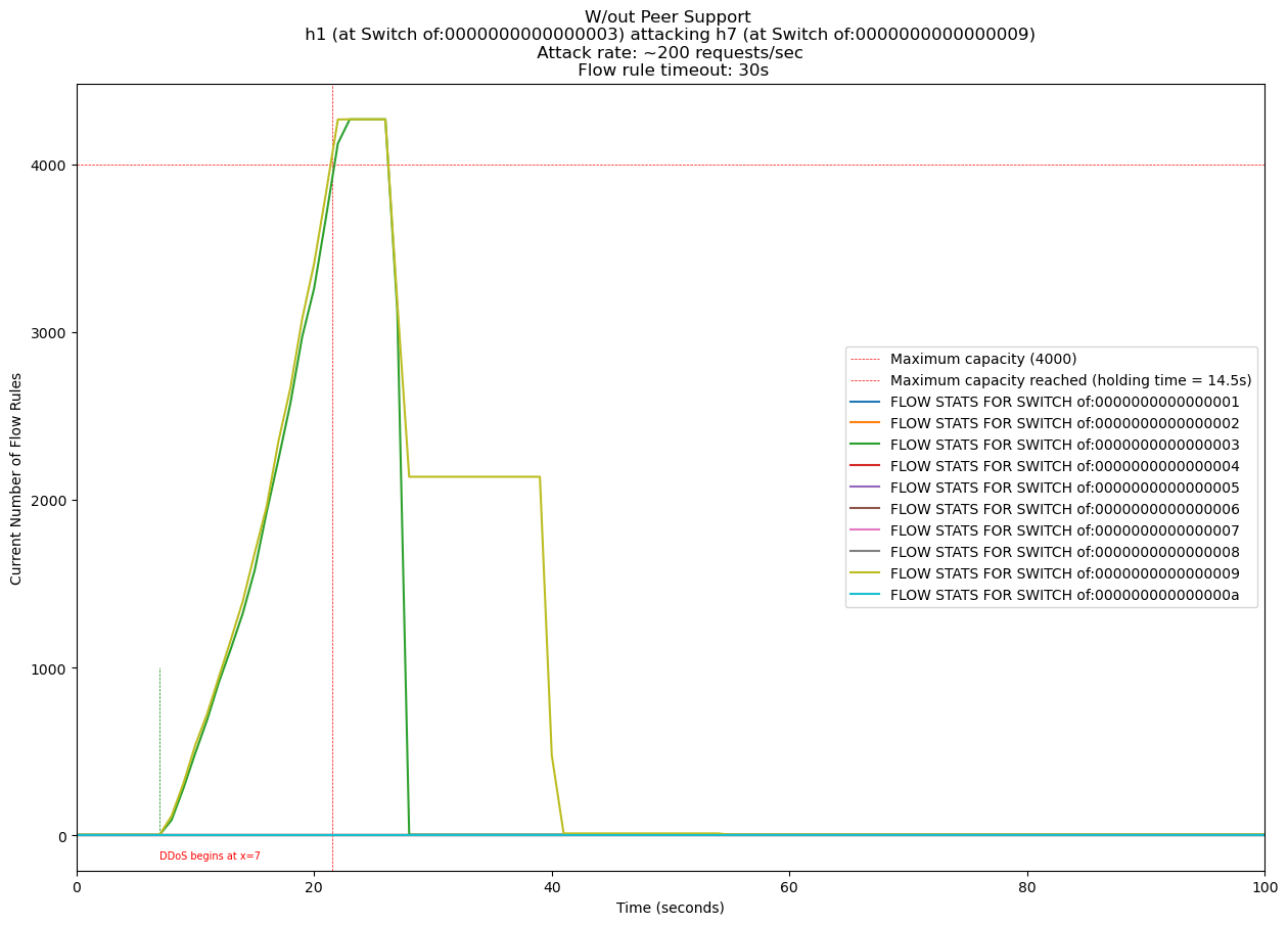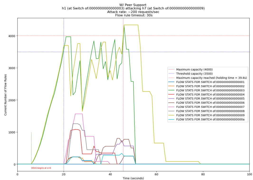 This project is based off the work of Yuan et al. [1], and explores how empty flow tables of neighboring switches can be used to increase a network's holding time against DDoS attacks. Please refer to this report↗ for a more detailed writeup of the project.